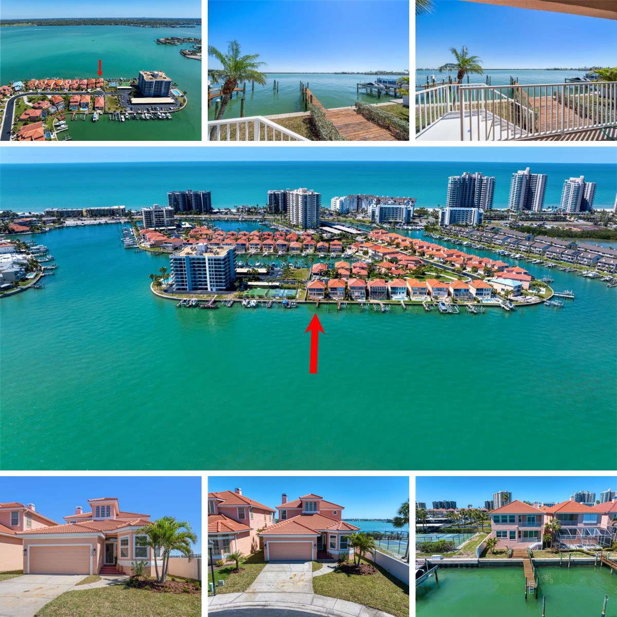 WIDE OPEN WATER VIEWS in the ONLY SINGLE-FAMILY GATED WATERFRONT COMMUNITY of its kind on Sand Key! This stunning estate exemplifies waterfront elegance in true Florida style. Boasting 2,911 SqFt of living space, the home features 4 bedrooms, 4 bathrooms, and a dedicated office/den. Recently remodeled with the utmost attention to detail, it showcases a collection of high-end finishes and luxurious appointments throughout. Enjoy panoramic, wide-open water views framed by lush, manicured landscaping. The open floor plan is both inviting and awe-inspiring, with soaring freshly painted ceilings and abundant natural light pouring through generous windows. The impressive living and dining areas, with new wide-plank hardwood flooring, overlook the open water, providing an ideal space for both relaxation and entertainment. For the culinary enthusiast, the custom-designed solid wood kitchen is a dream come true. It includes a large oversized island, brand-new stainless steel appliances, stunning quartz countertops, and a state-of-the-art 8-burner natural gas cooking range. A double-wide refrigerator and built-in drawer microwave elevate the kitchen experience. The exquisitely crafted custom range hood and built-in seating area serve as captivating focal points of the room. This home offers not one, but two oversized primary suites on the second floor, each featuring electric fireplaces and private balcony access. Revel in breathtaking sunrises and watch dolphins from the comfort of your own home. Both suites can easily accommodate the most luxurious bedroom furniture collections. The newly remodeled primary bathrooms are a testament to high-end design, with custom cabinetry, quartz countertops, expansive glass walk-in showers, luxury fixtures, and ceramic tile reaching all the way up to the ceiling. The walk-in closets are also a highlight, with custom-built cabinetry ensuring ample storage and organization. No expense has been spared in this home's design, from the new wide-plank luxury coastal hardwood flooring throughout the first and second floors—including the stairways—to the new modern stairway railing, which completes the upscale aesthetic. Every bathroom has been meticulously crafted with the finest finishes to satisfy the most discerning tastes. The generous dock offers deep-water access with two wet slips and the potential for two boat lifts. An extended deck provides the perfect space for an outdoor kitchen or seating area, and with no fixed bridges, easy boat access to the Gulf of Mexico is a breeze. Built with block and slab-on-pilings on a higher elevation, the home keeps flood insurance costs low and remained high and dry during hurricane seasons. A brand-new tile roof was installed in 2024. Situated within the highly desirable, 24-hour manned gated community of "The Moorings of Sand Key," this luxury estate offers unparalleled value for boaters and those seeking a secure, exclusive lifestyle. Walking distance to beach access, and right across from the guard house, this rare end-lot property offers even more privacy and unobstructed views. Whether you're locking it and going or staying to enjoy all the amenities, this property is truly one-of-a-kind.